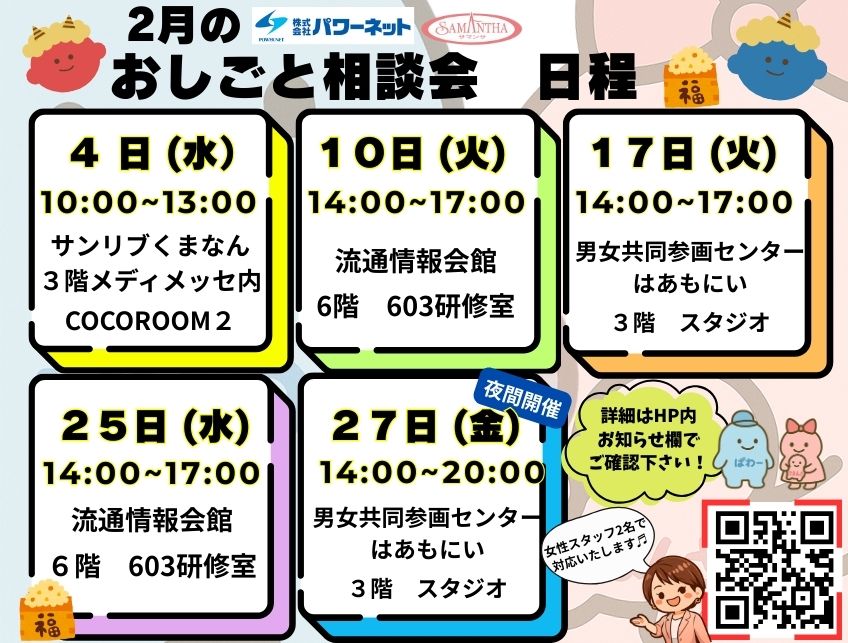 さて、遅くなってますが、1月のおしごと相談会、併せて2月のおしごと相談会のお知らせです!!