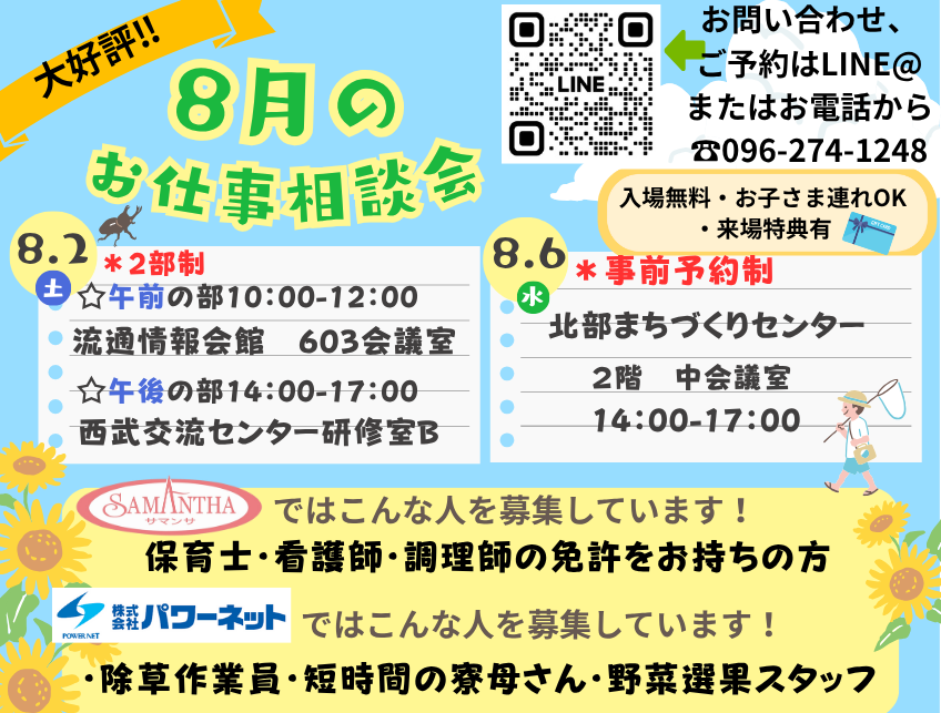 さて、8月もパワーネット・サマンサでは、暑さに負けずおしごと相談会開催いたします(^^)/